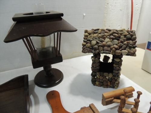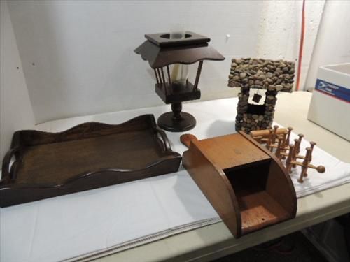 LOT 5 VINTAGE WOOD ITEMS: SERVING TRAY, TIE RACK, CANDLE HOLDER AND HAND CRAFTED STONE WISHING WELL. AS SHOWN. VIEW PICTURE FOR DETAIL.