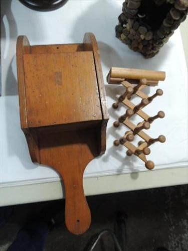 LOT 5 VINTAGE WOOD ITEMS: SERVING TRAY, TIE RACK,
