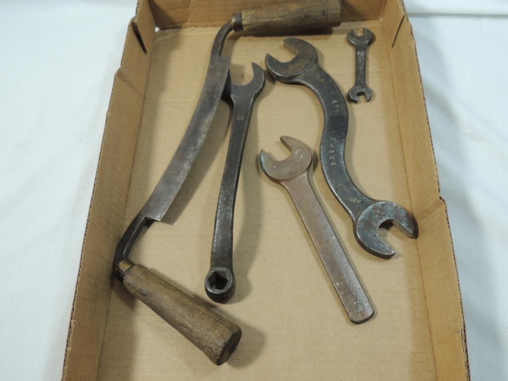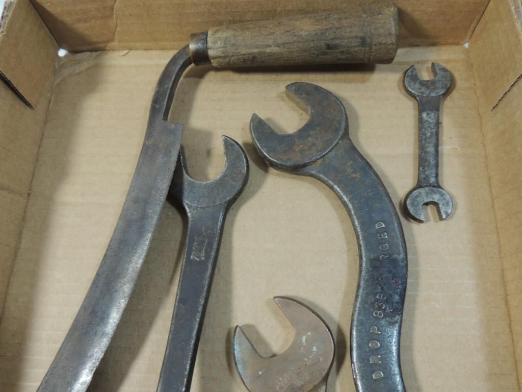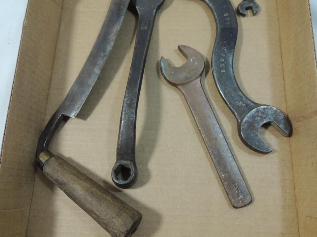 VINTAGE WRENCHES AND ANTIQUE TWO HANDLED PLANE. AS SHOWN. SEE PHOTO FOR MORE DETAILS.