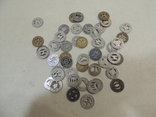 LOT 50 VINTAGE ASSORTED CITY BUS FARE TOKENS. AS SHOWN. VIEW PICTURE FOR DETAIL.