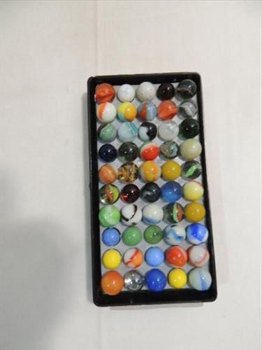 LOT 50 VINTAGE MARBLES: KORK SCREWS, CAT EYES, CLEARIES, AND MORE. AS SHOWN. VIEW PICTURE FOR DETAIL.