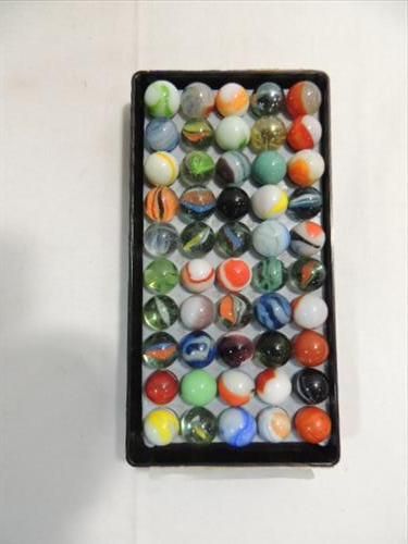 LOT 50 VINTAGE MARBLES: KORK SCREWS, CAT EYES, CLEARIES, AND MORE. AS SHOWN. VIEW PICTURE FOR DETAIL.