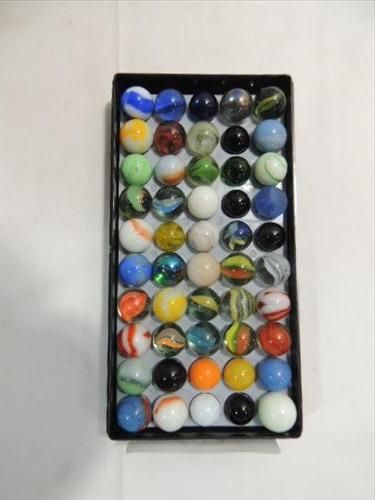 LOT 50 VINTAGE MARBLES: KORK SCREWS, CAT EYES, CLEARIES, AND MORE. AS SHOWN. VIEW PICTURE FOR DETAIL.