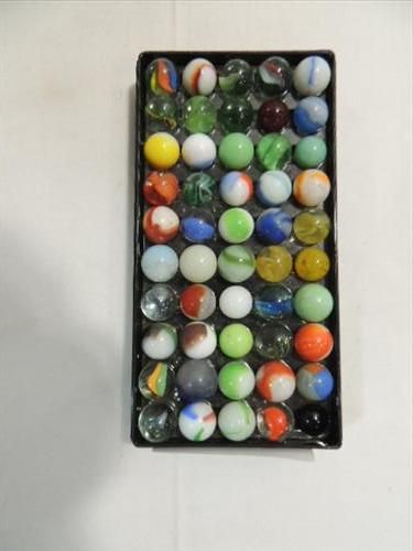 LOT 50 VINTAGE MARBLES: KORK SCREWS, CAT EYES, CLEARIES, AND MORE. AS SHOWN. VIEW PICTURE FOR DETAIL.