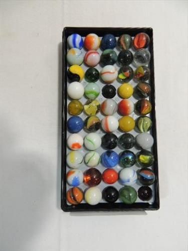 LOT 50 VINTAGE MARBLES: KORK SCREWS, CAT EYES, CLEARIES, AND MORE. AS SHOWN. VIEW PICTURE FOR DETAIL.