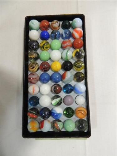 LOT 50 VINTAGE MARBLES MIX STYLES & MAKERS. CAT EYES, SOLIDS AND MORE. AS SHOWN. VIEW PICTURE FOR DETAIL.