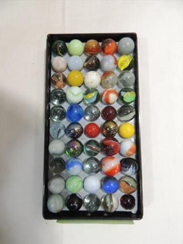 LOT 50 VINTAGE MARBLES MIX STYLES & MAKERS. CAT EYES, SOLIDS AND MORE. AS SHOWN. VIEW PICTURE FOR DETAIL.