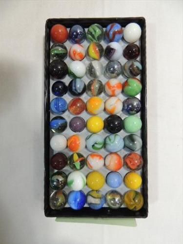 LOT 50 VINTAGE MARBLES MIX STYLES & MAKERS. CAT EYES, SOLIDS AND MORE. AS SHOWN. VIEW PICTURE FOR DETAIL.