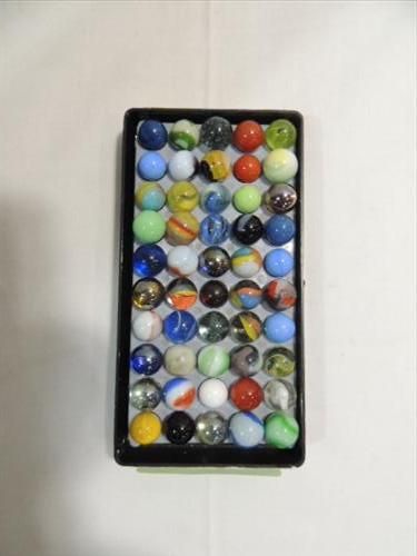 LOT 50 VINTAGE MARBLES MIX STYLES & MAKERS. CAT EYES, SOLIDS AND MORE. AS SHOWN. VIEW PICTURE FOR DETAIL.