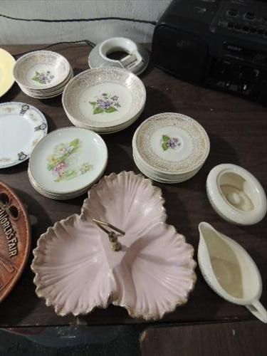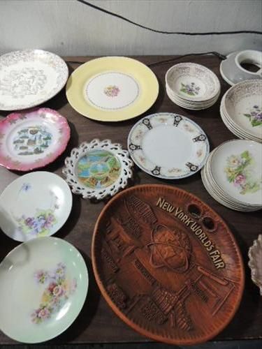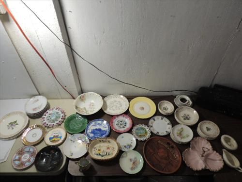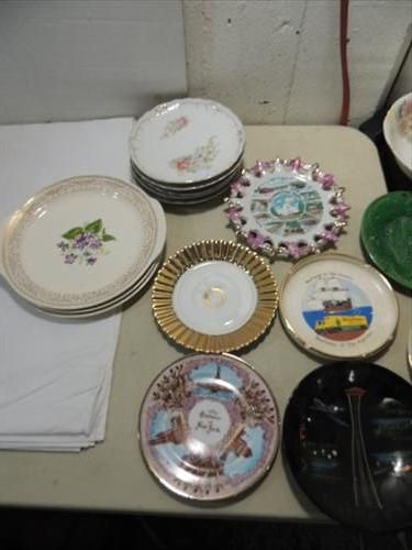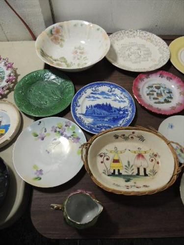 LOT 57 ASSORTED VINTAGE PORCELAIN & CERAMIC PLATES, DINNERWARE, SOUVENIR PLATES, BOWLS AND MUCH MORE. AS SHOWN. VIEW PICTURE FOR DETAIL.