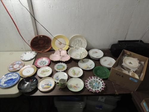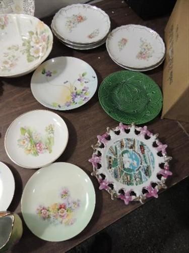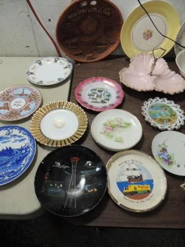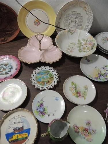 LOT 57 ASSORTED VINTAGE PORCELAIN & CERAMIC PLATES, DINNERWARE, SOUVENIR PLATES, BOWLS AND MUCH MORE.  AS SHOWN.  VIEW PICTURE FOR DETAIL.