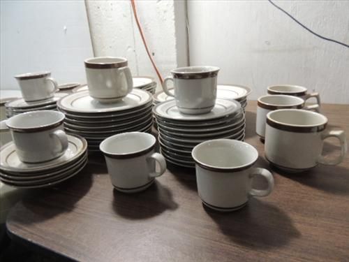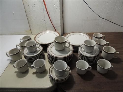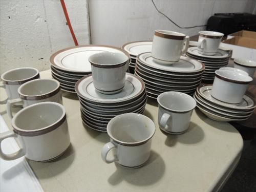 LOT 59 SIERRA STONEWARE, SIMPLICITY PATTERN: 13 DINNER PLATES, 4 BERRY BOWLS, 18 SAUCERS, 15 CUPS, 9 SALAD PLATES. AS SHOWN. VIEW PICTURE FOR DETAIL.