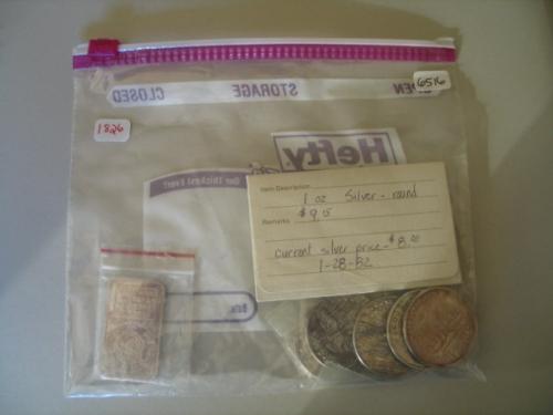 LOT, (6) 1 OZ SILVER COINS 1 OZ INGOT