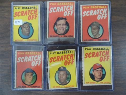 LOT 6 1970 TOPPS SCRATCH OFF BASEBALL CARDS: JONES, MCARVER, COBERT, HEGAN, BOSMAN, WYNN. AS SHOWN. VIEW PICTURE FOR DETAIL.