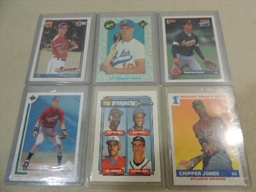 LOT 6 1990-92 ALL CHIPPER JONES BASEBALL CARDS. ASSORTED MAKERS. AS SHOWN. VIEW PICTURE FOR DETAIL.