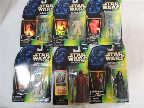 LOT 6 1996 HASBRO STAR WARS ACTION FIGURES: GREEDO, BOSSK, R5-D4, SENTINEL, MEDIC DROID, PALPATINE. AS SHOWN. VIEW PICTURE FOR DETAIL.