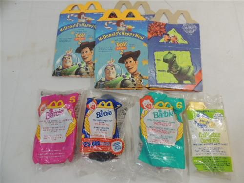 LOT 6 1999 MCDONALD HAPPY MEAL COLLECTIBLES: 2 TOY STORY 2 PUZZLE MEAL BOXES, 3 BARBIE #1, 5, 6 & 1 MAGIC SCHOOL BUS. AS SHOWN. VIEW PICTURE FOR DETAIL.