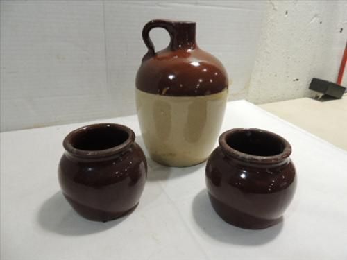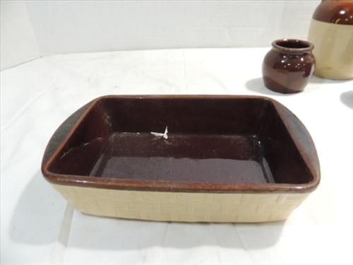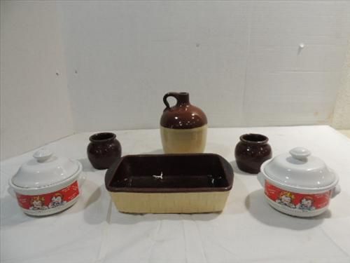 LOT 6 (2)CAMPBELL SOUP BOWLS & 4 BROWN EARTHENWARE. SALT GLAZE. CAKE PAN, JUG. AS SHOWN. VIEW PICTURE FOR DETAIL.