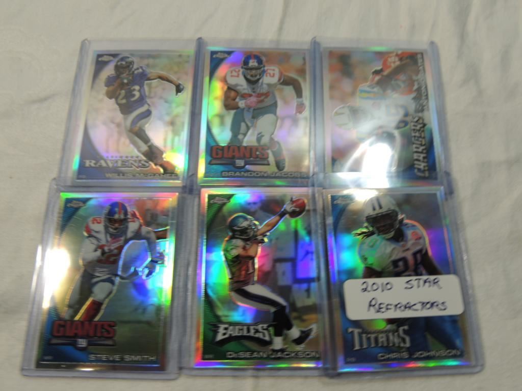 CHRIS JOHNSON, DESEAN JACKSON, STEVE SMITH, ANTONIO GATES, BRANDON JACOBS, WILLIS MCGAHEE FOOTBALL PLAYER CARDS. TRADING CARDS. COLLECTIBLE. FOOTBALL MEMORABILIA. GOOD CONDITION AS SHOWN. SEE PHOTO FOR MORE DETAILS.