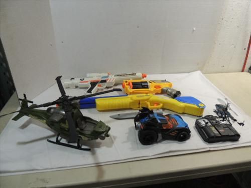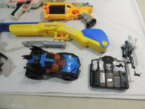 LOT 6 (3) NERF DART GUNS, PLASTIC MILITARY HELICOPTER, BATMAN RC BATMOBILE. AS SHOWN. VIEW PICTURE FOR DETAIL.