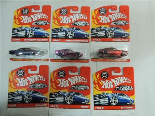 LOT 6 40TH ANNIVERSARY HOT WHEEL CLASSICS: 240Z, ROAD RUNNER, SHELBY, NOVA AND MORE. AS SHOWN. VIEW PICTURE FOR DETAIL.