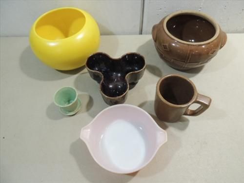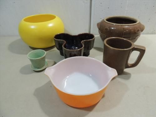 LOT 6 (5) CONTEMPORARY POTTERY & 1 PYREX BOWL: HAEGER, HULL, MONMOUTH AND MORE. AS SHOWN. VIEW PICTURE FOR DETAIL.