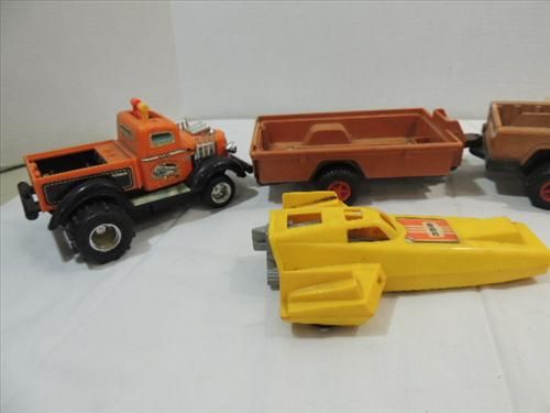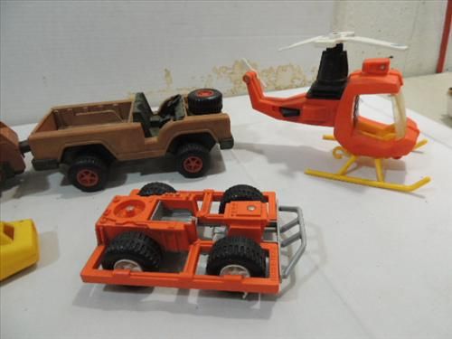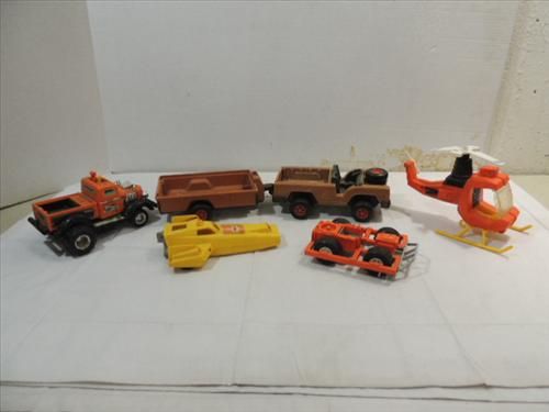 LOT 6 (5) VINTAGE FISHER-PRICE TOY VEHICLES: JEEP & TRAILER, HELICOPTER, AND MORE. AS SHOWN. VIEW PICTURE FOR DETAIL.