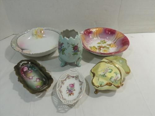 LOT 6 ANTIQUE BAVARIAN CHINA: 2 BOWLS, RELISH DISH, HANDLE CANDY DISH & BROKEN EGG VASE. AS SHOWN. VIEW PICTURE FOR DETAIL.
