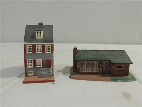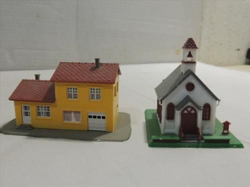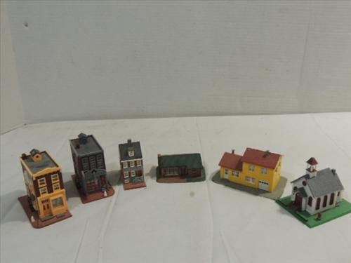 LOT 6 ASEMBLED N GAUGE PLASTIC MODEL 3 HOMES & 2 BUSINESSES & 1 STEEPLE CHURCH. AS SHOWN. VIEW PICTURE FOR DETAIL.