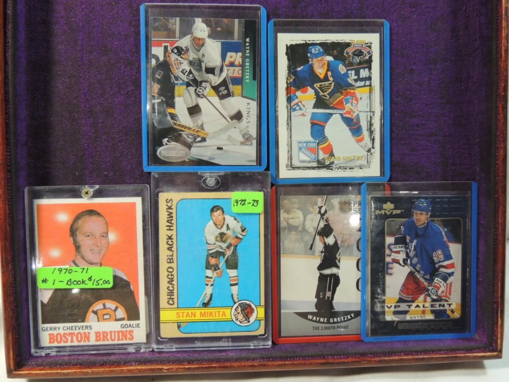 1970-71 TOPPS GERRY CHEEVERS 1972-73 TOPPS STAN MIKITA WAYNE GRETZKY HOCKEY PLAYER CARDS. PARKEHURST #99, UPPER DECK #MVP1, FLEER # 8, 2000 PROSET 2000TH POINT #703. MIXED YEARS. TRADING CARDS. GREAT CONDITION. IN PROTECTIVE PLASTIC SLEEVES
