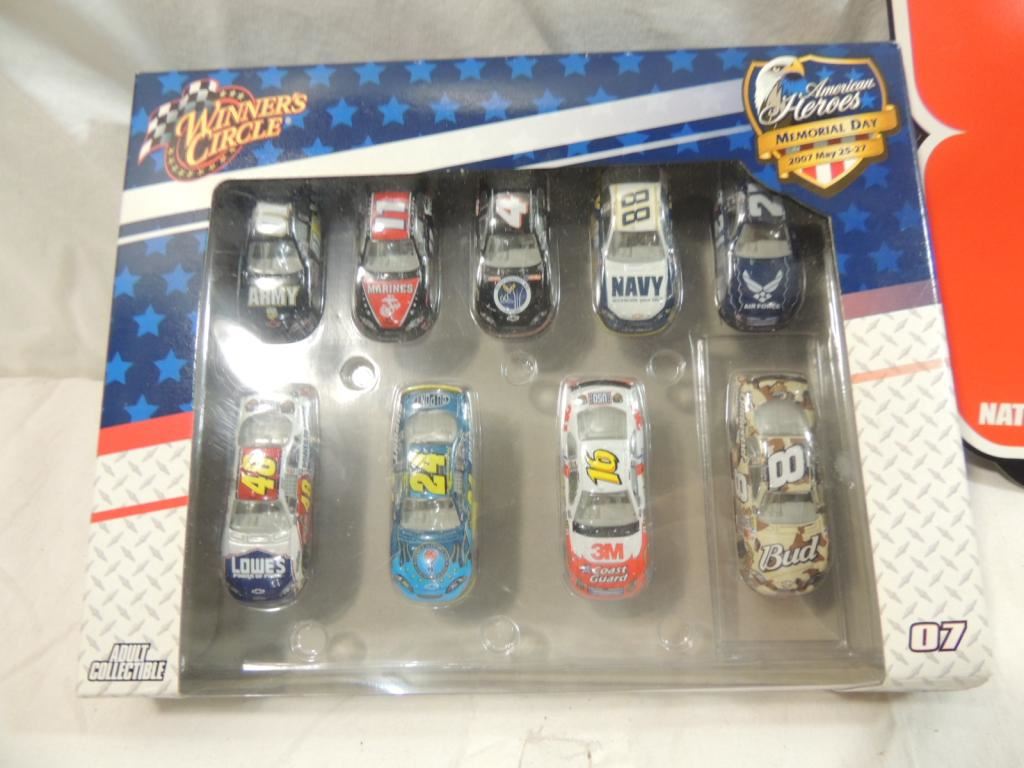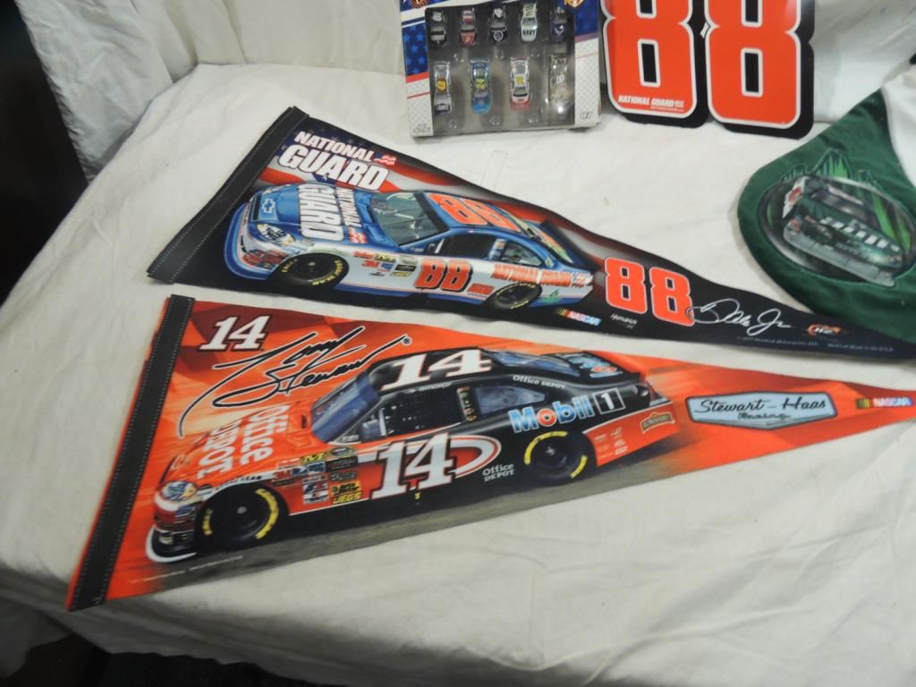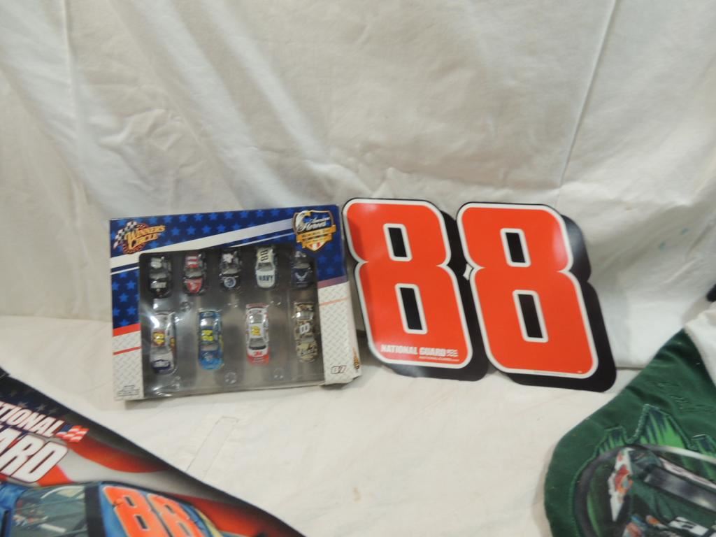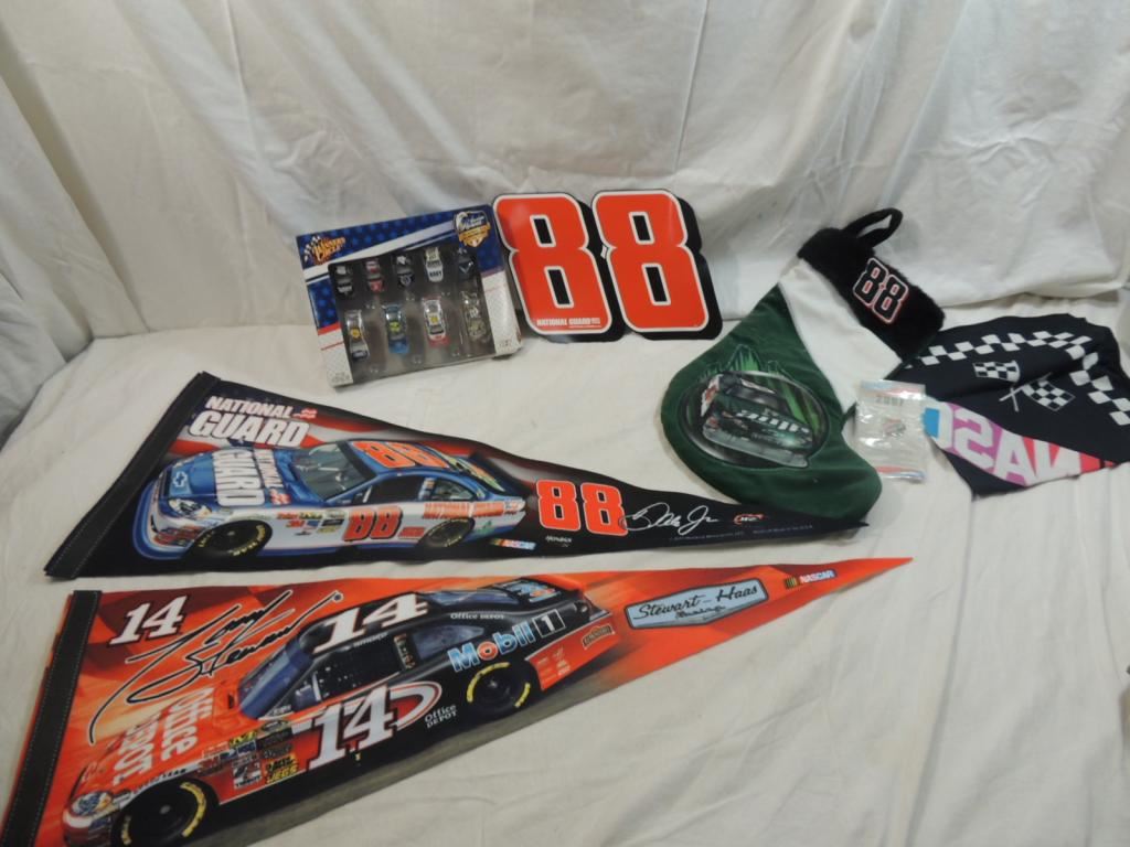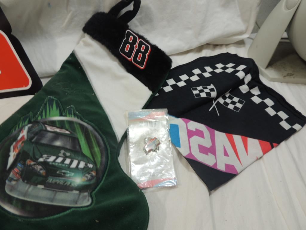 NINE 1:87 SCALE STOCK CARS ASSORTED NASCAR CARS, #88 CUTOUT, TWO PENNENTS, CHRISTMAS STOCKING, COLLECTIBLE STOCKING AS SHOWN SEE PHOTO FOR MORE DETAILS.