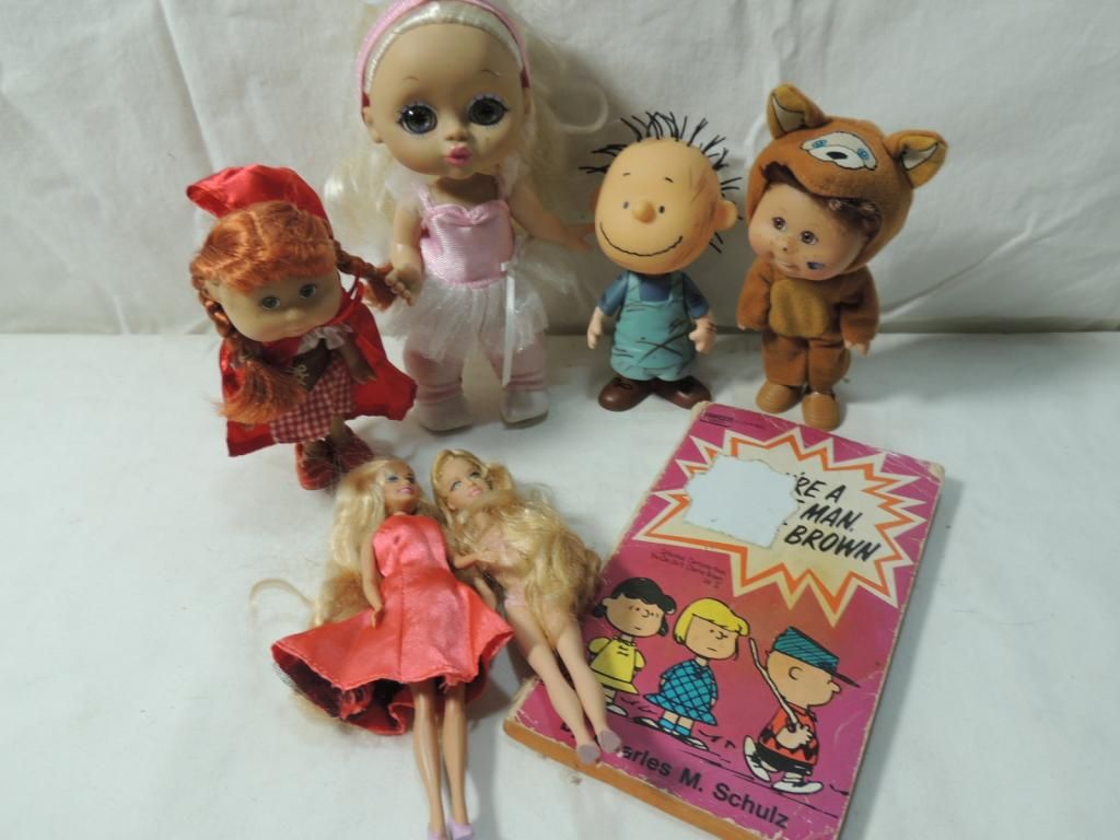 ASSORTED DOLLS. CABBAGE PATCH DOLLS, BRATZ DOLL, LINUS PEANUTS DOLL, THE PEANUTS CHARLES SCHULZ BOOK SMALL BARBIE DOLLS