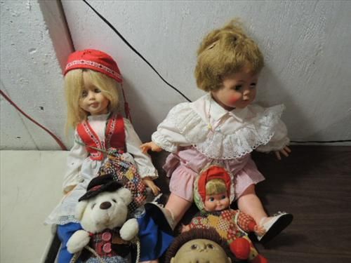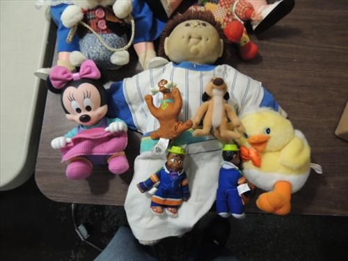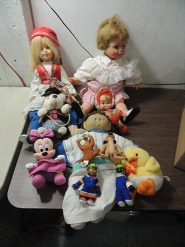 LOT 6 ASSORTED VINTAGE DOLLS: MINNIE MOUSE, 3 VINYL DOLLS WITH SLEEPY EYES, CABBAGE PATCH KID AND MORE. AS SHOWN. VIEW PICTURE FOR DETAIL.
