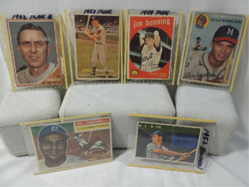 1962 TOPPS #85 GIL HODGES. 1952 BOWMAN #69 JOE ADCOCK. 1954 TOPPS #30 BASEBALL PLAYER CARD ED MATHEWS. 1957 TOPPS #262 BOBBY THOMSON. 1956 TOPPS #101 BASEBALL CARD ROY CAMPANELLA. 1959 TOPPS #149 JIM BUNNING. AS SHOWN. SEE PHOTO FOR DETAILS.
