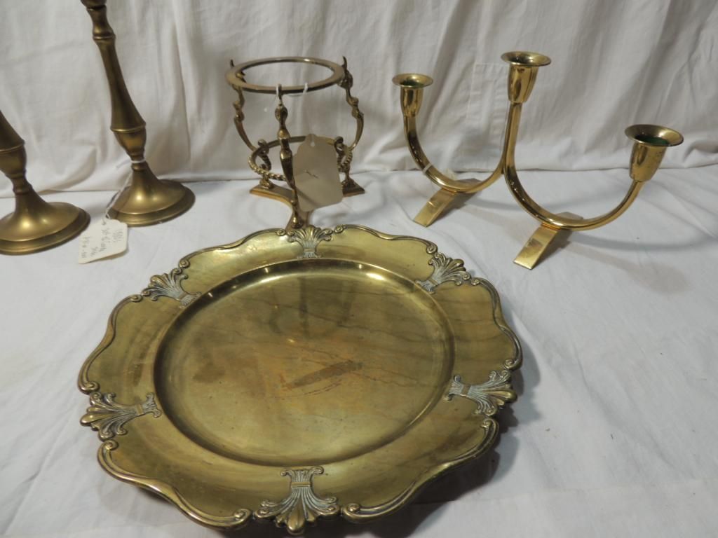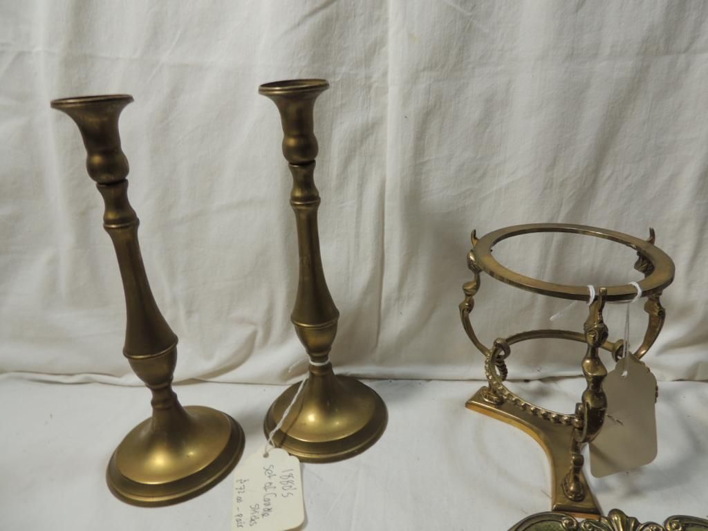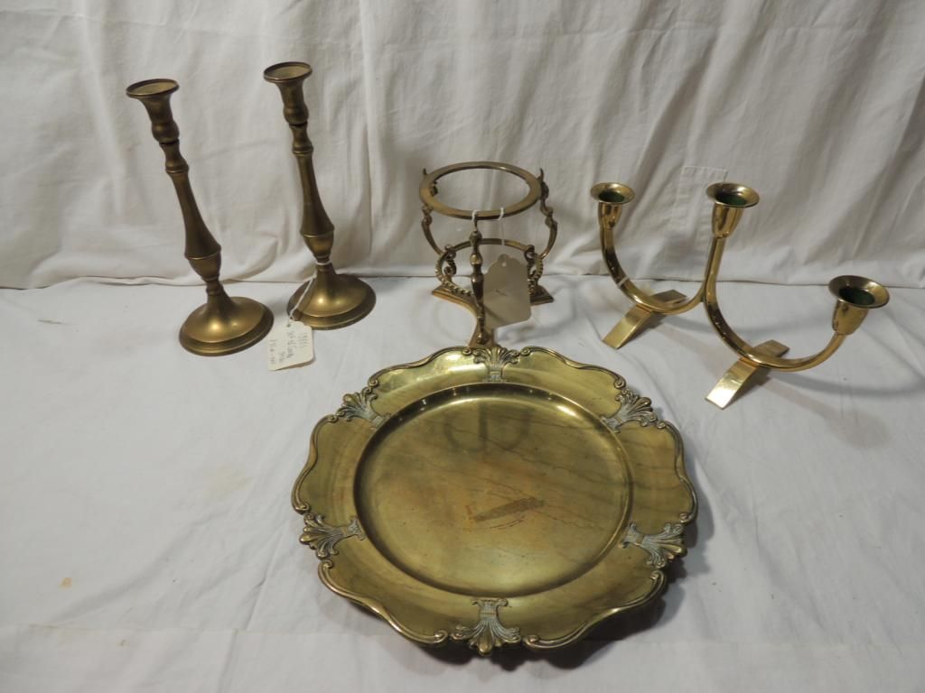 PAIR CANDLE HOLDERS, CANDLEABRA, DECORATIVE STAND, DECORATIVE TRAY. AS SHOWN. SEE PHOTO FOR MORE DETAILS.