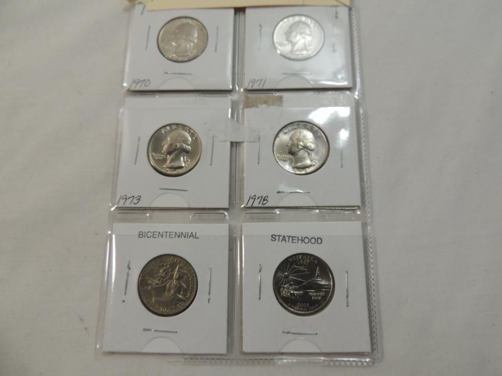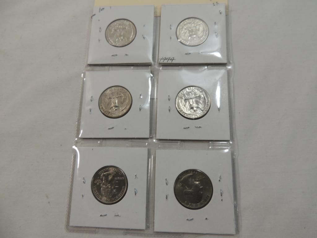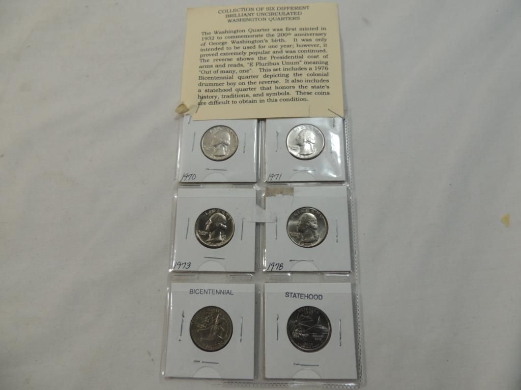 COLLECTION OF SIX DIFFERENT BRILLIANT UNCIRCULATED WASHINGTON QUARTERS. UNITED STATES COIN SET. US CURRENCY. COIN MONEY COLLECTIBLE. AS SHOWN SEE PHOTO FOR MORE DETAILS.