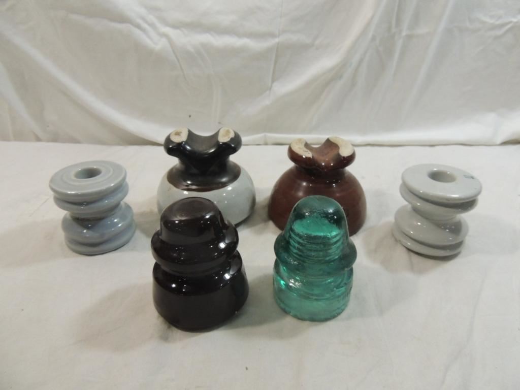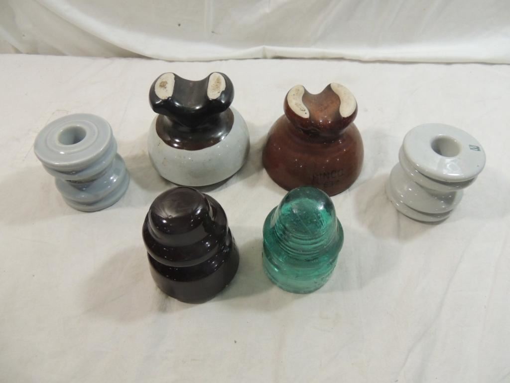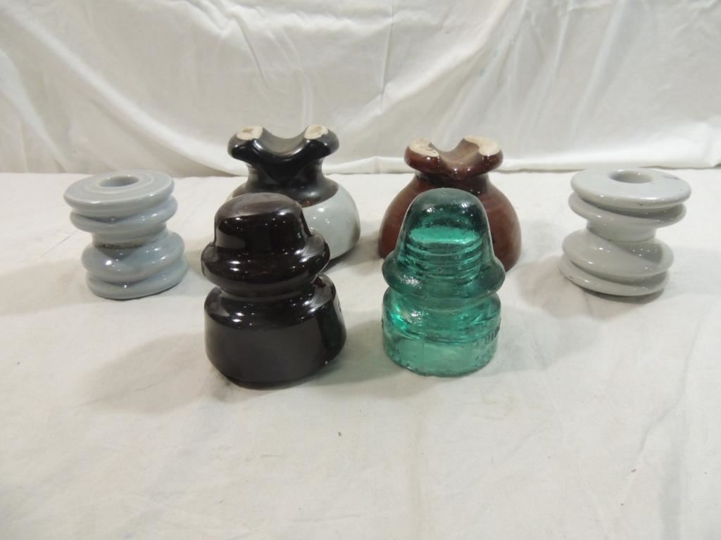 BLUE GREEN GLASS INSULATOR, CERAMIC, WHITE GLAZE, BROWN GLAZE CERAMIC AS SHOWN SEE PHOTO FOR MORE DETAILS.