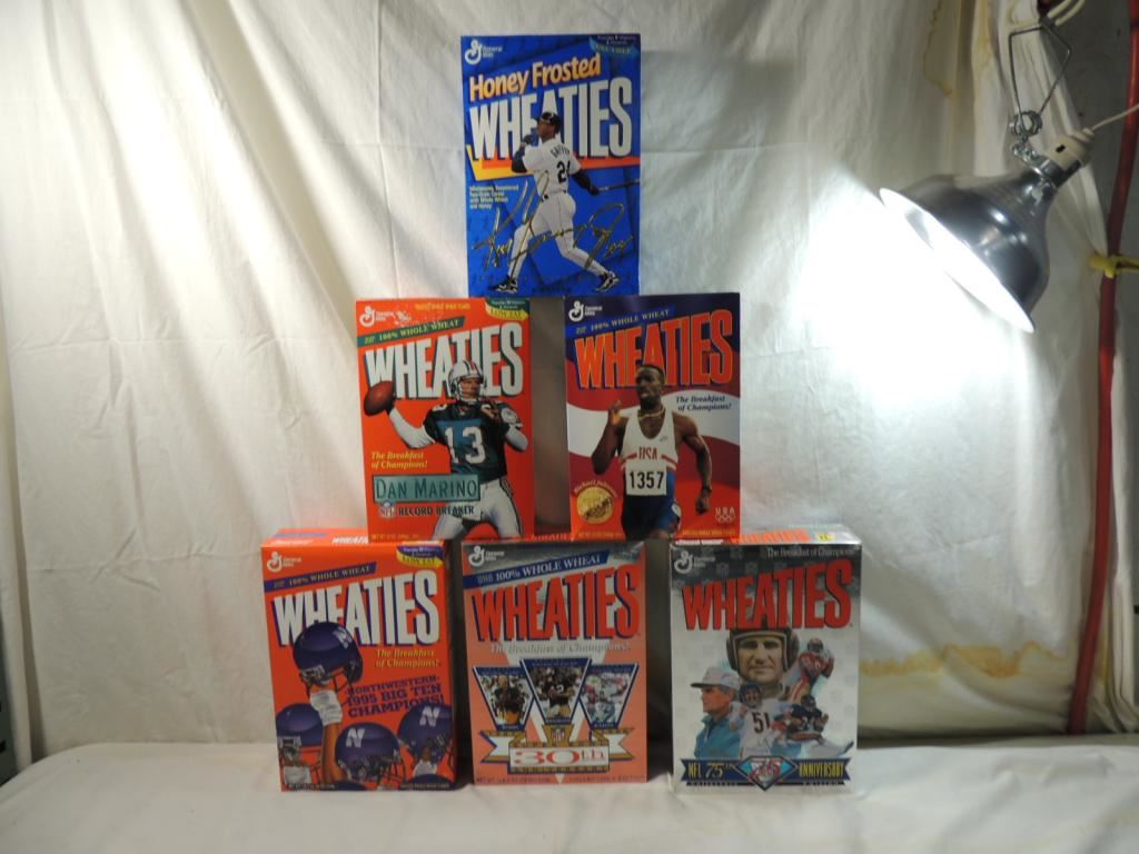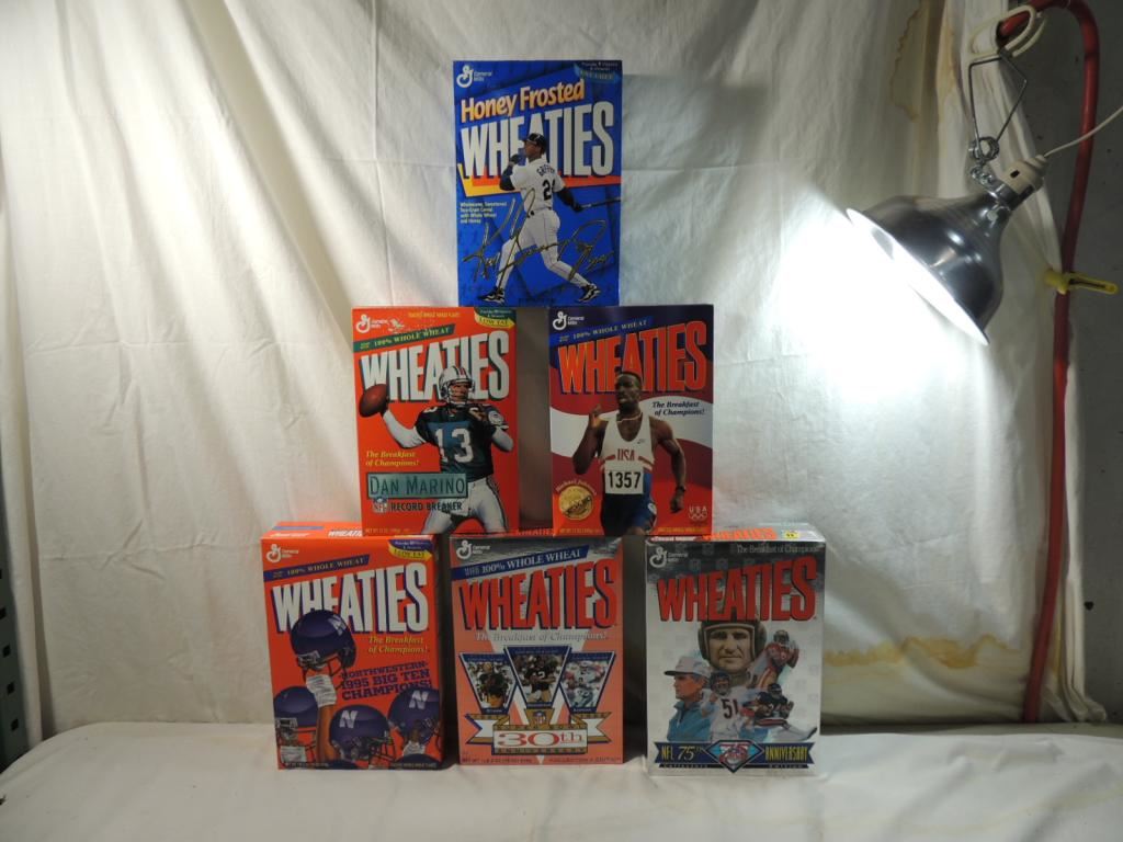 WHEATIES COLLECTIBLES NFL 75TH ANNIVERSARY COLLECTORS EDITION & DAN MARINO RECORD BREAKER KEN GRIFFEY JR BOX AND NORTHWESTERN WILDCATS COMMEMORATIVE BOXES. COLLECTORS BOXES AS SHOWN SEE PHOTO FOR MORE DETAILS.
