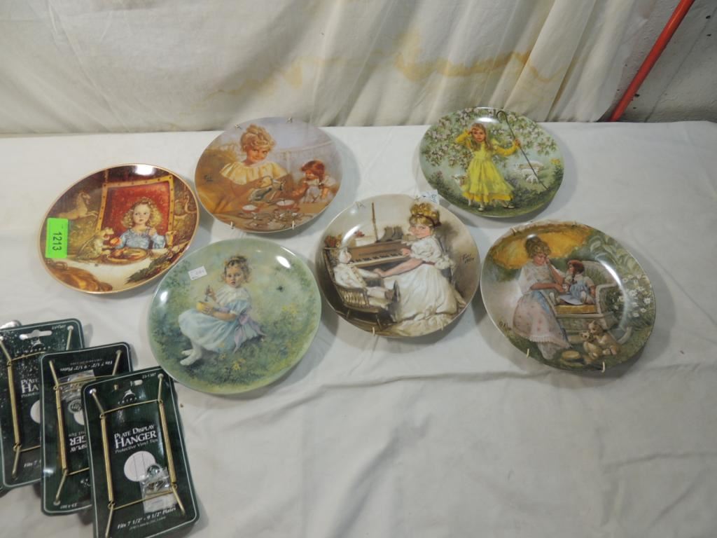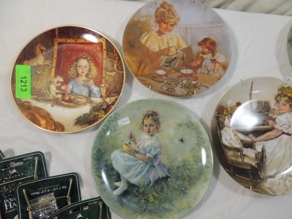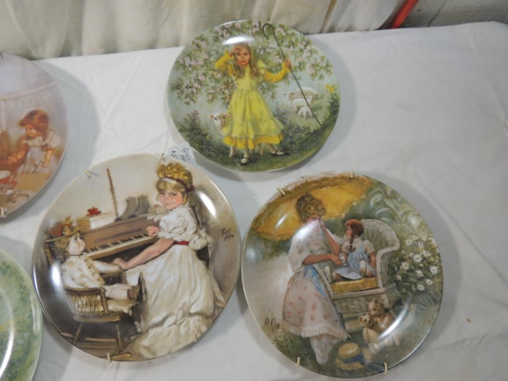 THE FROG PRINCE, CORAS TEA PARTY, LITTLE MISS MUFFET, CORAS RECITAL, LITTLE BO PEEP, CORAS GARDEN PARTY, PLATE HANGERS INCLUDED, DECORATIVE PLATES, COLLECTORS PLATES, LIMITED EDITION PLATES, COLLECTIBLE, KNOWLES, DESIGNER PLATES, AS SHOWN SEE PHOTO FOR MORE DETAILS.