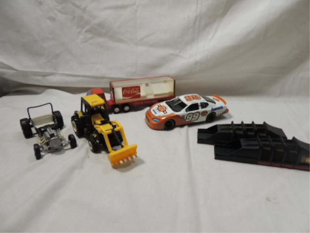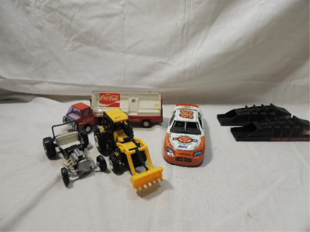 LOT 6 DIE CAST METAL AND PLASTIC TOY CARS, COCA COLA TRUCK, NASCAR CAR, CONSTRUCTION TRUCK, ERTL, HOT WHEELS, AND MORE