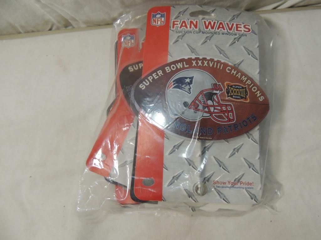 FAN WAVES SUCTION CUP MOUNTED WINDOW SIGN. SUPER BOWL XXXVIII CHAMPIONS NEW ENGLAND PATRIOTS SHOW YOUR PRIDE NFL NEW. COLLECTIBLE. SPORTS MEMORABILA. FOOTBALL TEME LOGO SIGN. AS SHOWN SEE PHOTO FOR MORE DETAILS.