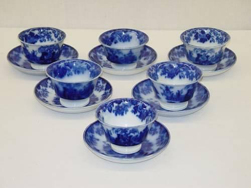 LOT (6) FLOW BLUE HANDLELESS CUPS and SAUCERS - SCINDE PATTERN BY ALCOCK - MINOR CHIPS and HAIRLINES;