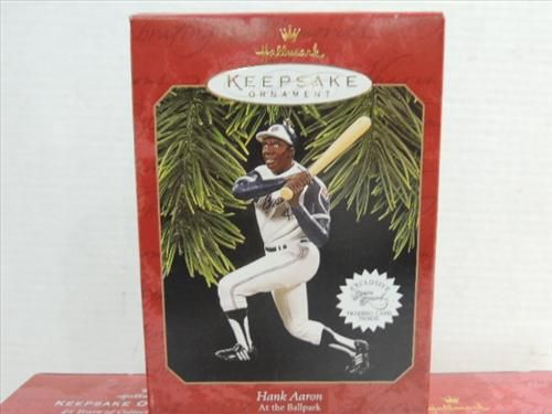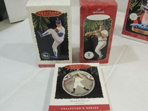 LOT 6 HALLMARK BASEBALL & NASCAR HOLIDAY ORNAMENTS: PETTY, GORDON, GEHRIG, AARON, RIPKEN, RYAN. AS SHOWN. VIEW PICTURE FOR DETAIL.