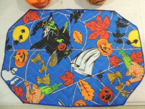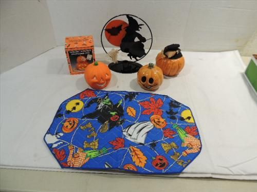 LOT 6 HOLLOWEEN TABLE DECORATIONS: 4 CERAMIC PUMPKINS, METAL WITCH CANDLE HOLDER AND PLACEMAT. AS SHOWN. VIEW PICTURE FOR DETAIL.