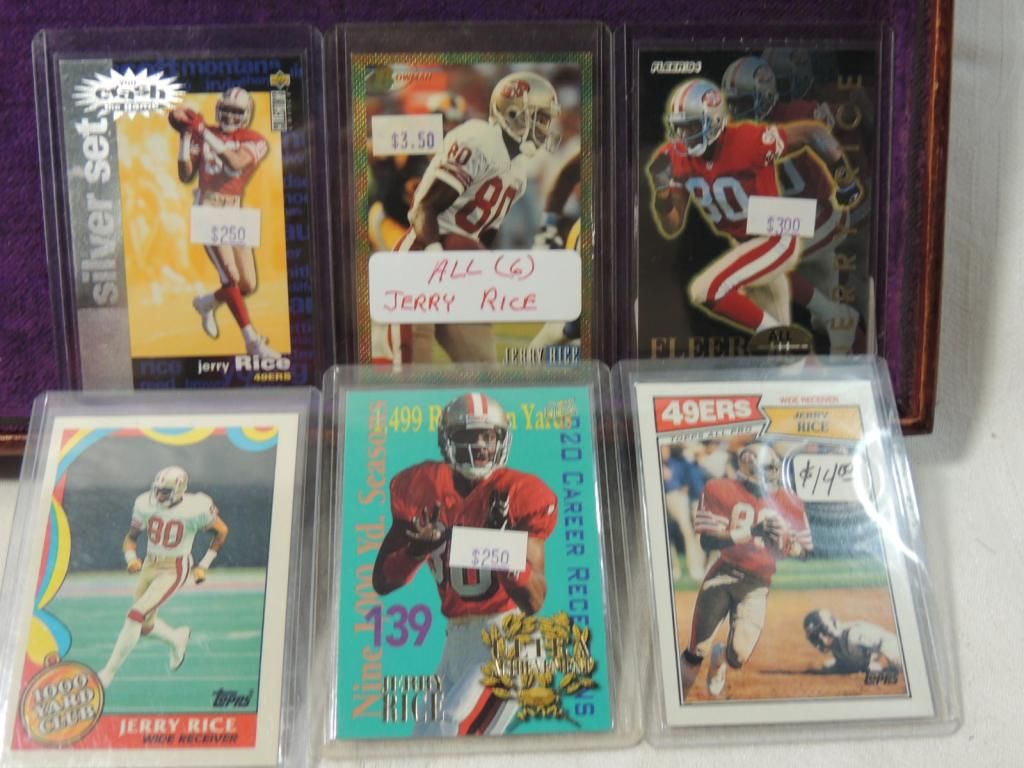 LOT 6 JERRY RICE FOOTBALL CARDS FOOTBALL PLAYER CARD, FOOTBALL TRADING CARD. AS SHOWN. SEE PHOTO FOR MORE DETAILS.