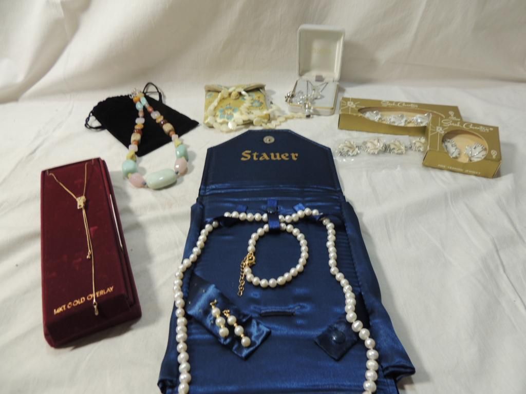 PASTEL STONE NECKLACE. HONORA COLLECTION SHELL NECKLACE, VINTAGE CRYSTAL NECKLACE AND EARRINGS. DIANN IN CASE. 14KT GOLD OVERLAY ZIPPER NECKLACE. STAUER ORGANIC PEARL NECKLACE EARRINGS AND BRACELET SET. SARAH COVENTRY INC LEAF SET. SILVERTONE. FASHION JEW