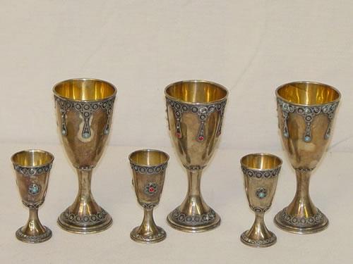 LOT (6) MIDDLE EASTERN SILVER GOBLETS: (3) 2 7/8" CORDIALS W/ JEWELED DECORATION & (3) 4 3/4" WINES W/ JEWELED DECORATION-ALL MARKED STANETZK ISRAEL, 7.5 TROY OZ. - MINOR DENTS, WEAR, & LOSSES