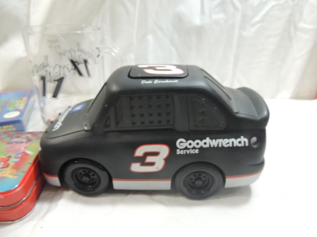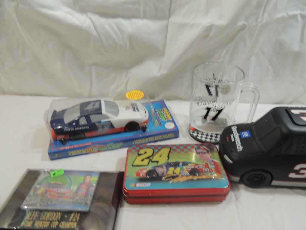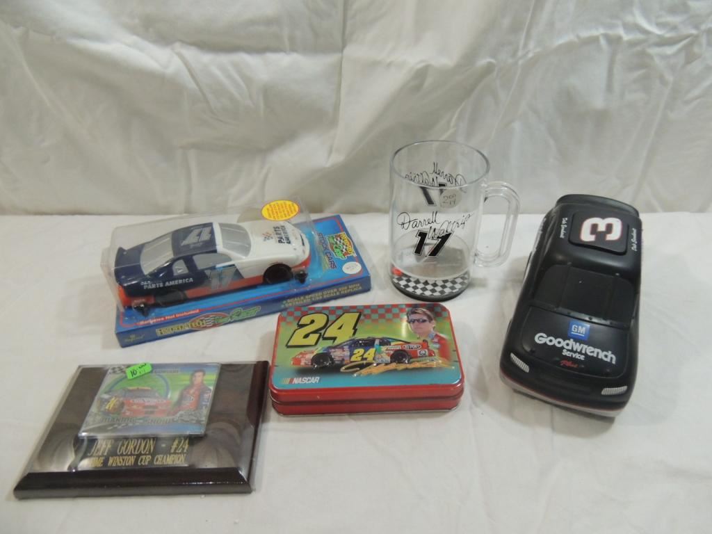 TOY PUSH CAR DALE EARNHARDT CAR, DARRELL WALTRIYS #17 COLLECTORS MUG, JEFF GORDON CARD ON PLAQUE, COLLECTORS CAR, COLLECTIBLE TIN, AS SHOWN SEE PHOTO FOR MORE DETAILS.