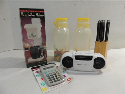 LOT 6 MISCELLANEOUS ELECTRONICS: RADIO, CALCULATOR, SINGLE CUP COFFEE MAKER, SIX STEAK KNIFE SET AND MORE. AS SHOWN. VIEW PICTURE FOR DETAIL.