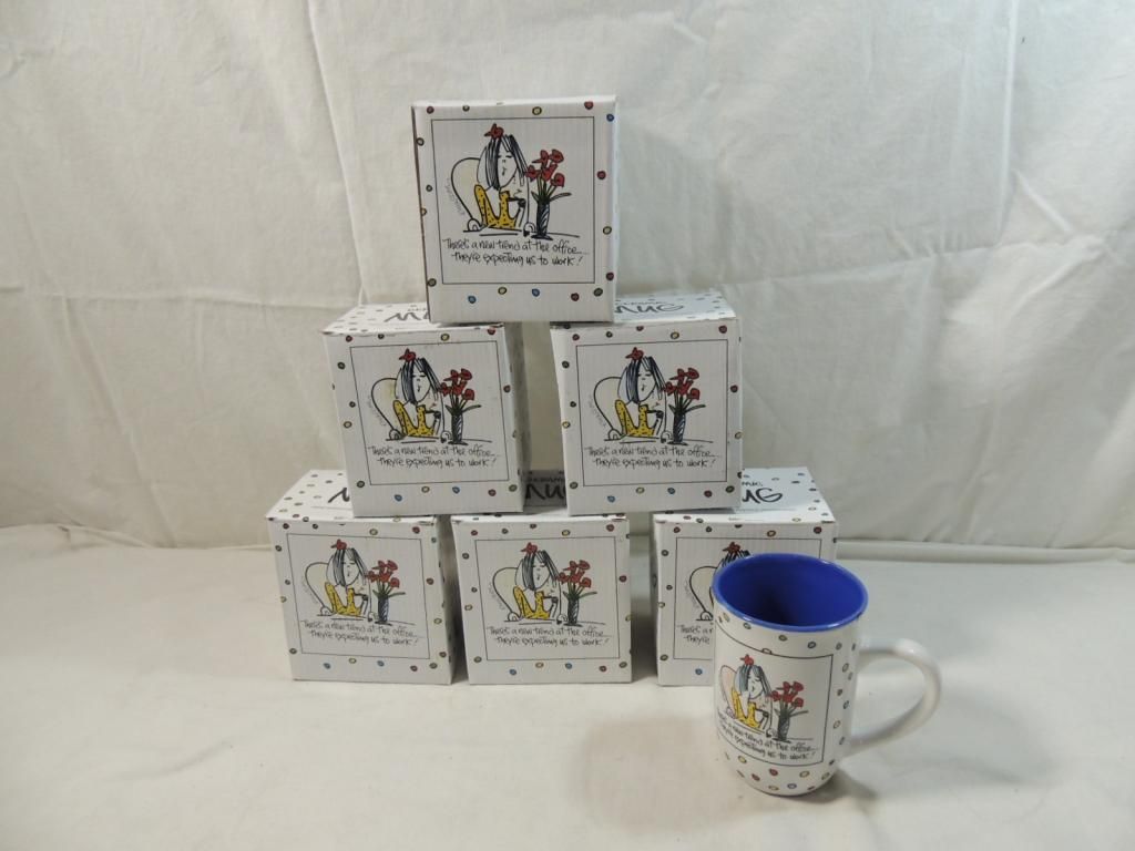 NEW CERAMIC MUGS "THERES A NEW TREND AT THE OFFICE...THEY'RE EXPECTING US TO WORK!" IN BOXES. NEVER USED. GREAT FOR GIFTS. CUTE STYLISH COFFEE MUG. EMERSON HUMOR WHITE MUG WITH COLORED POKA DOTS. AS SHOWN SEE PHOTO FOR MORE DETAILS.